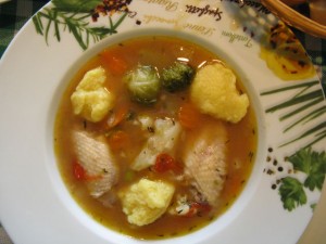 pri nas danes: grahova juha z zlatimi kroglicami, pečen kotlet morskega psa, kamut z zelenjavo in zelje v solati