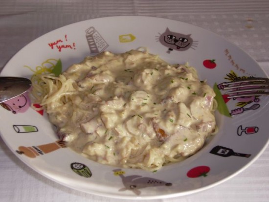 Špageti preliti z jurčkovo omako, radič s fižolom: