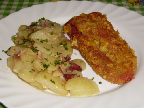 Pražen krompir, panirana - pečena - s sirom in šunko nadevana paprika, rdeča pesa: