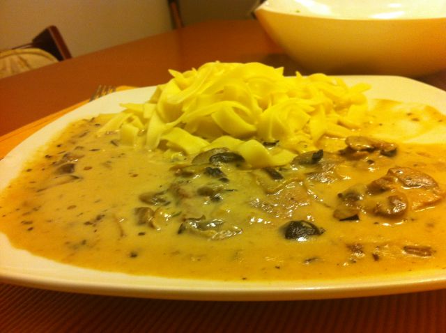 Pri nas danes telečji zrezki z gobovo omako, široki rezanci in zelena solata