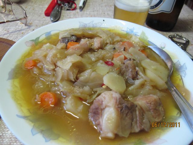 No, ja, tam v tistem rdečem so eni E-ji za rdečo barvo, v zelju pa spet E-ji za zeleno, v mesu so itak glutaminati ( spet eni hudi E-ji ), pa še zraven mi je ( ponesreči ) not padla ena jušna kocka, sem je držal in tuhtal, a bi je dal ali ne, pa mi je kar padla. Kaj za enih E-jev v popru in kumini ne upam niti brskat