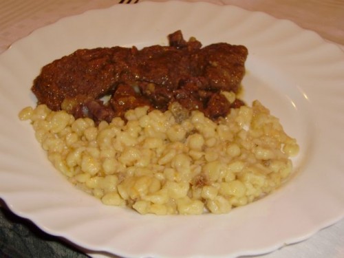 Goveja juhica (od včeraj), goveji zrezki, koščki gov. repa (iz juhe), špecli, rdeča pesa: