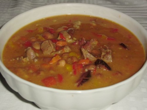 Fižolova juha s koščki prekajenega mesa.