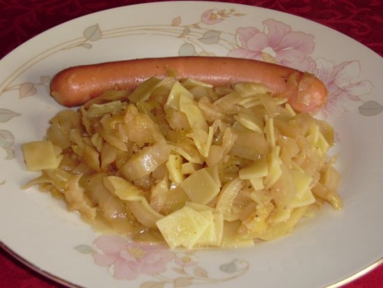 Goveja juhica z domačimi rezanci; krpice z zeljem, hrenovka: