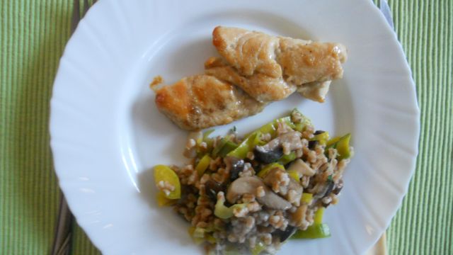 zrezki v omaki, ajdova kaša s šampinjoni, šaljat ![]()