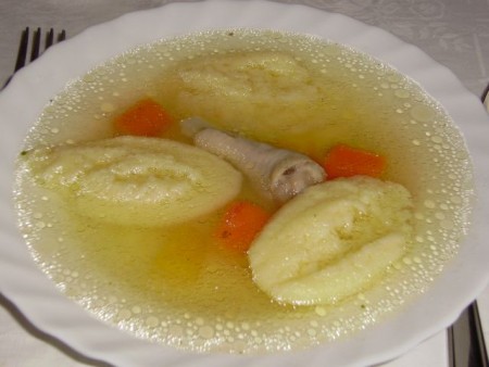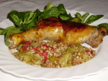 Kurja juhica z zdrobovimi knedli; pečeno piščančje bedro (premazano z medom in zenfom), ajdova kaša na poru in papriki; matovilec: