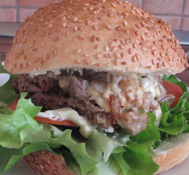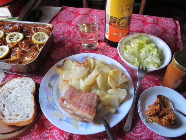 Danes pri nas kraljevski hamburger (pleskavica polnjena z odojkom in sirom - smo mal reciklirali!) in 2 deci domačhga rdečga: