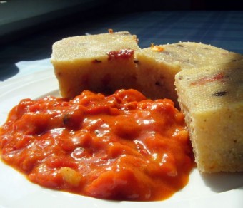 Danes končno nekaj, kar ni sladoled: polenta s suhim paradižnikom, olivami in zelišči, pogret pinđur