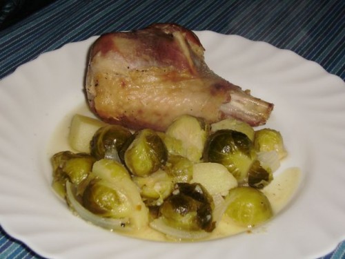 Pečeno puranje bedro, brstični ohrovt s krompirjem, zelena solata s fižolom: