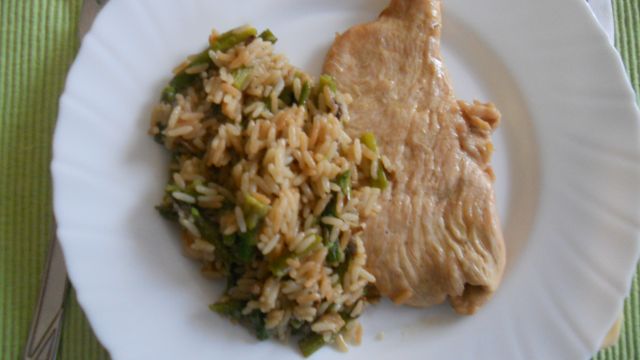 cervusDanes: rižota z zelenimi beluši in suhimi jurčki, svinjski zrezki, mešana solata (radič, rukolo, fižol)