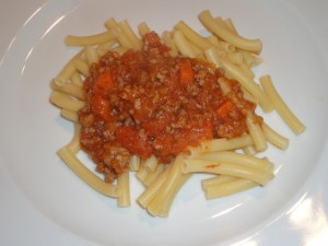 Danes: testenine z omako, solata in ćokoladno pecivo.
