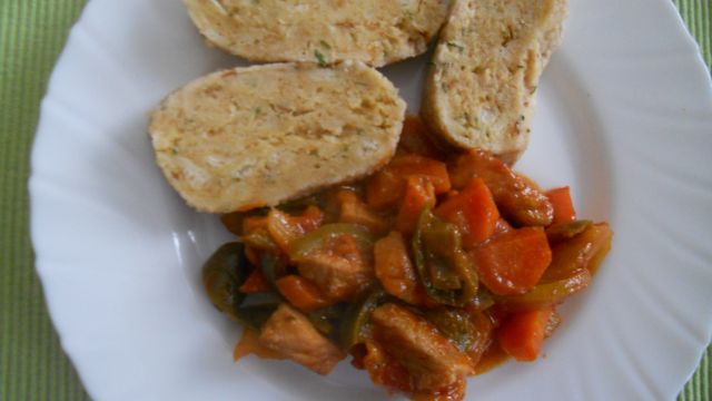 SonjaDanes: kruhov cmok z drobtinami, piščančji file z zelenjavo, kitajsko zelje v solati s fižolom