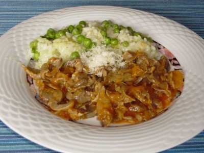 rizi-bizi, piščančji želodčki v vinski omaki; zelena solata: