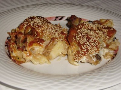 Reciklaža kosila od sobote - prelito z beljaki, kislo smetano in prepečenim sezamom, vse zapečeno v pečici; zelena solata: