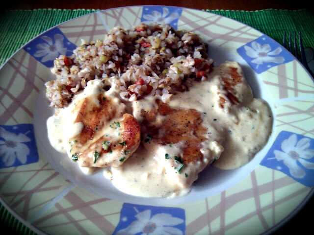 Dušena ajdova kaša s porom in rdečo papriko, piščančji file v smetanovo česnovi omaki, skleda solate...