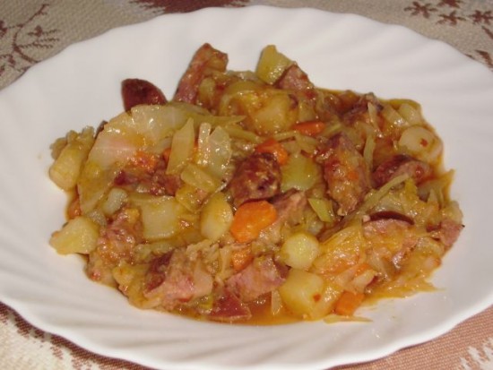 Goveja juhica (od včeraj); sladko zelje s krompirjem in klobaso; zelena solata:
