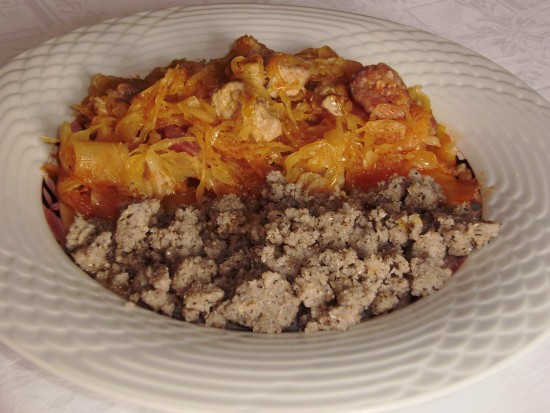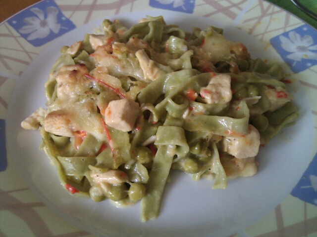 ZuckerfeeŠpinačni rezanci v okami iz piščančjega mesa, korenčka, pora, graha, rdeče paprike, sladke smetane. Popečeno v pečici s čisto malo sira...solata