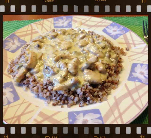 VesnuskaAjdova kaša z gobovo omako s koščki piščanca..
