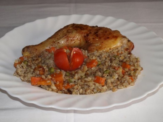 Ajdova kaša na čebuli, korenčku in grahu, v družbi s pečeno piščančjo nogico; kisla paprika kot solata: