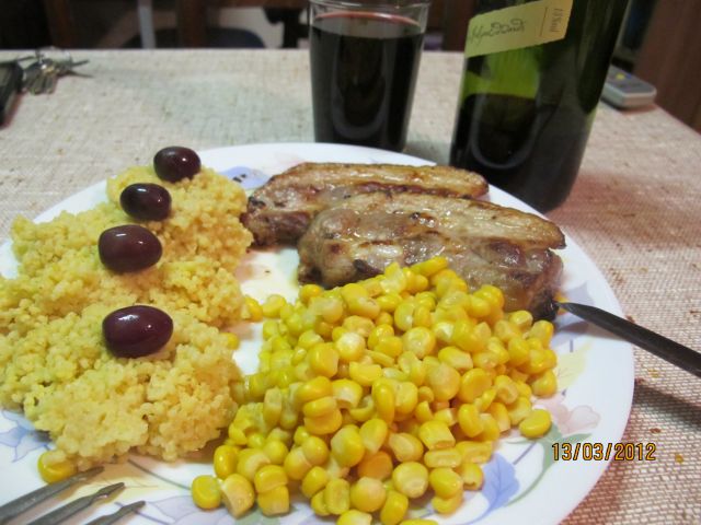 Sporočilo je spremenil(a) dragička dne 13. 2012 15:24Zeljne krpice, en mali file ocvrtega osliča in en zelenjavni zrezek. Solata, kitajsko zelje, koruza.
