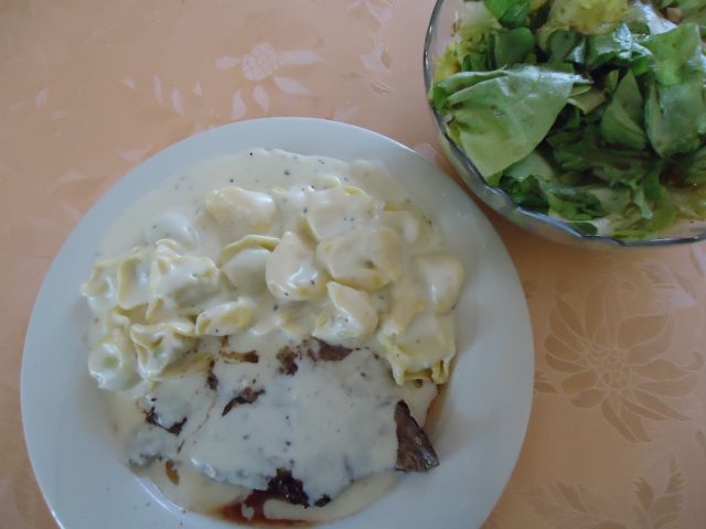 VesnuskaGovej zrezek, špinačni tortelini z omako in zelena solata: