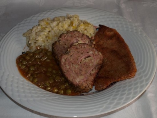 Piščančja juhica z domačimi rezanci; riž na poru, grah v omaki, mesna rolada s semeni, pohane paprike; zelena solata z radičem: