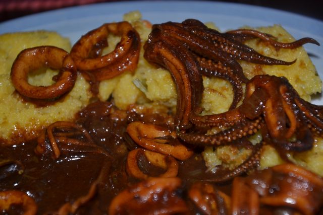 ledenka_Včeraj sva uživala v kombinaciji polente z zelišči in lignjev po receptu iz knjige o kuhinji Zanzibarja (čebula, česen, kokosovo mleko, kurkuma) - takole je bilo videti: