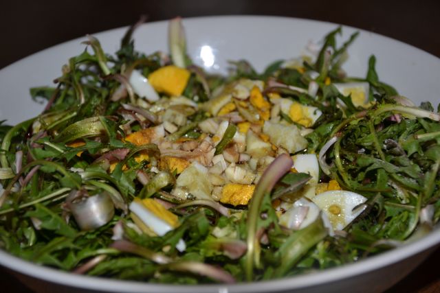 Za kosilo: čemaževa juha s krompirjem, špinača iz kopriv in pire, regrat s toplim krompirjem.