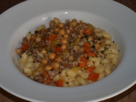 Makaroni z omako (omaka: bučke, korenček, čičerika, "razcefrana" pečenica); zelena solata: