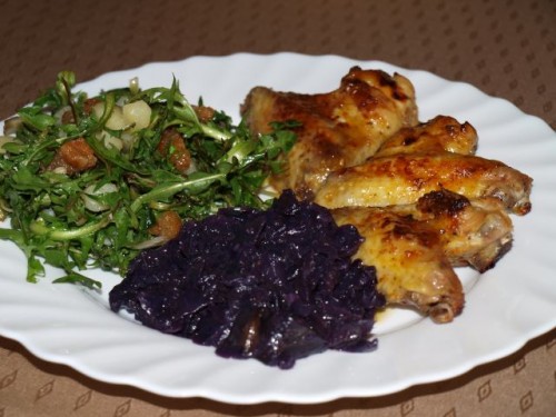 Pečene perutničke, rdeče zelje, regrat s krompirjem in zabeljen z ocvirki: