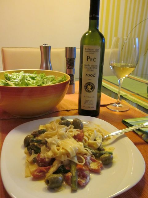 Kuhani široki sveži rezanci in potem potenstani skupaj, z olivami, češnjevcem in šparglji. Zraven sem dodala še malce feta sira in eno žlico kisle smetane. Vinčk je pa še z morja...