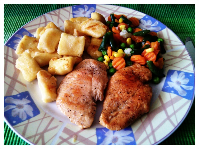 ledenka_Svaljki, piščančji file, zelenjava in solatka