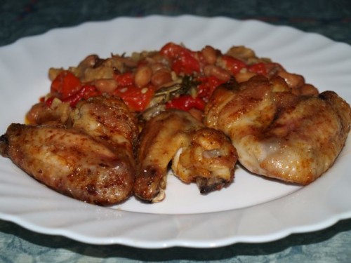 Pečene perutničke, zapečen fižol z rdečo papriko (iz skrinje), "Etina" kisla paprika: