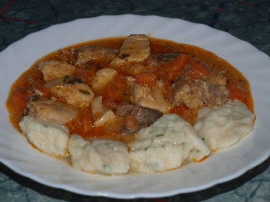 Piščančja juhica z domačimi rezanci; piščančji paprikaš, skutno-zdrobovi cmoki; zelena solata: