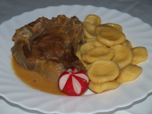 Telečja zarebrnica, ušeska (a la Anamarija), zelena solata in redkvice: