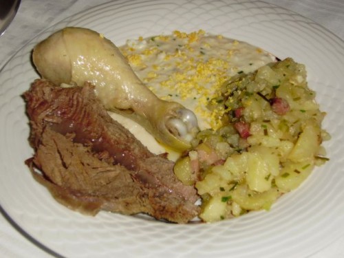Goveje-piščančja juhica z domačimi rezanci; kuhana govedina in kuhano piščančje meso - na kratko popečeno, pražen krompir, hrenova omaka z naribanim jajčkom; zelena solata;