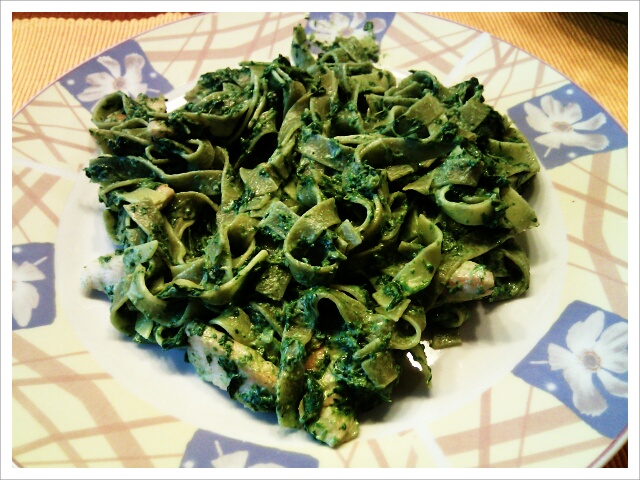 Špinačni rezanci s špinačo in piščančjim mesom, solata