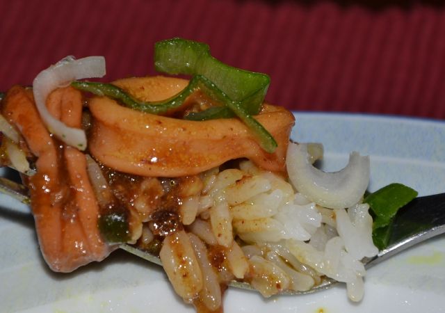 Mi danes: lignji po eni od indonezijskih variant, Bali,, po receptu iz ene knjige, malo improvozorano, zraven pa jasminov riž: