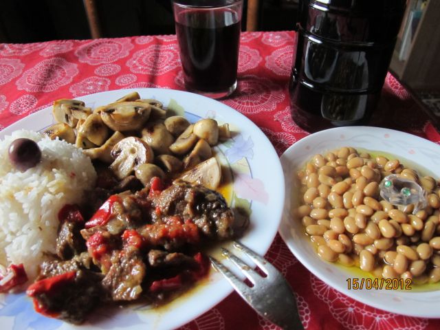 Goveja juha z rezanci, ciganski zrzki, riž, motovilec s fižolom in za konec malo naravnega tuširanja - dežuje - mi se pa silimo rože sadit.