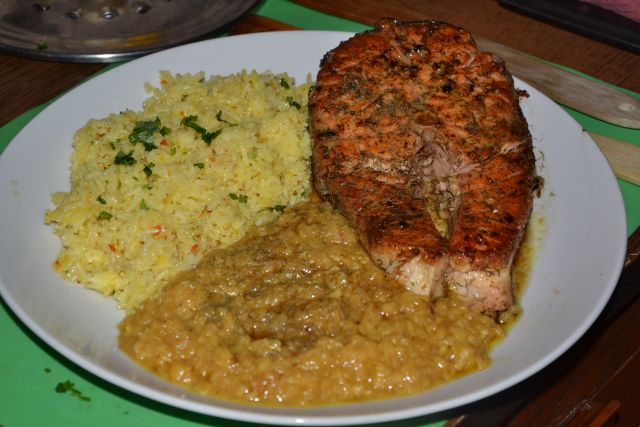 Losos z omako iz jabolk in ingverja plus pečen riž z žafranom in koriandrom: