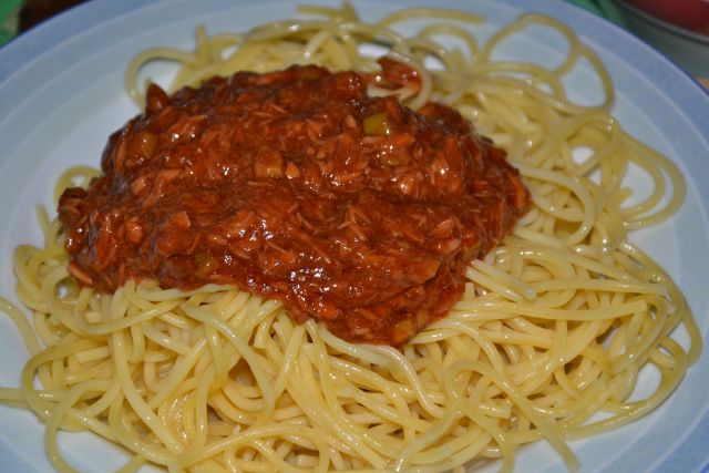 za del družine špageti s tuno v paradižnikovi omaki z olivami: