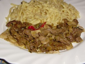 Govedina na trakce, por, mlada čebula, paprika, šampinjoni - vse zalito z vinom, vlivanci, zelena solata; šarkelj /a la Teta-torta/: