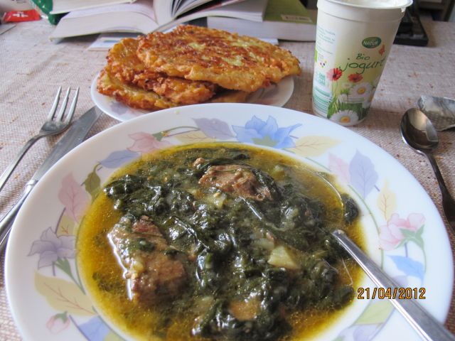 torej, od tiste pomladanske poezije mi je ostalo pol krožnika, pa sem zravn naredil eno špecialiteto ( tist svetlo rjavo zadaj ), je mal težko razložit, postopek izdelave je zelo zahtevn ( sestavine niti ne, krompir, jajce, čebula in mal moke in začimbe ), rabiš specialno pripravo za naribat krompir na " ta pravo velikost "............ ma ne da se pojasnit, naj povem kolk je zadeva zahtevna, tudi med poklicnimi kuharji to redko kdo dela. Sam sem ga polomil na koncu pri začimbah: pozabil sem dat po eno žličko kurkume, ingverja in cimeta. No, bom zapomnil za drugič ( uf, pa sojina omaka bi tudi pasala..................... ).