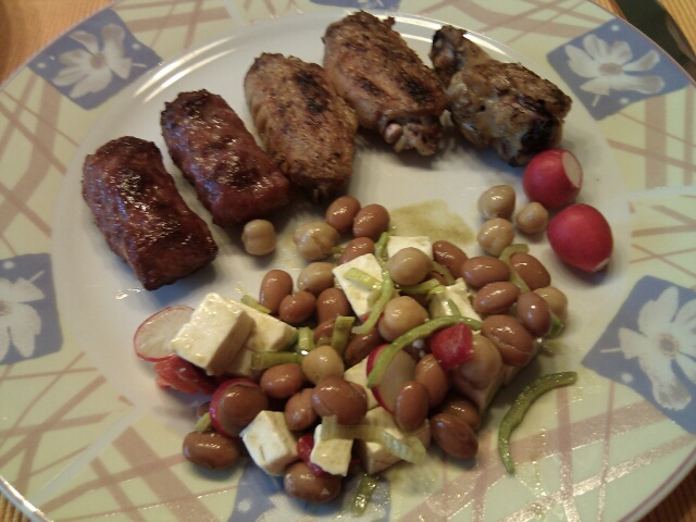MilžiMož si je kljub dežju zaželel nekaj z grila...čevapčiči in perutničke. Solata (fižol, čičerika, por, domača redkvica)