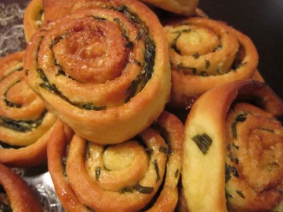 - štrudlova rozeta(morda špirala, zdaj so moderne?) z nadevom iz čemaža, kopriv, smetane in skute (z dodatkom začimb, pimenta ni bilo, koriandra tudi ne, ingverja tudi ne..)