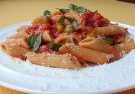 Polnozrnati peresniki z omako iz bučk, čebule in mandljev