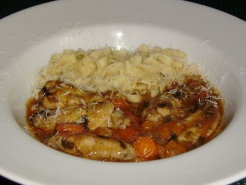 Piščančji paprikaš, domači široki rezanci - posuto s parmezanom; zelena solata z mlado čebulo.