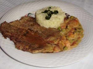 Žrebičkovi zrezki v omaki, riž z zelenjavo, solata.