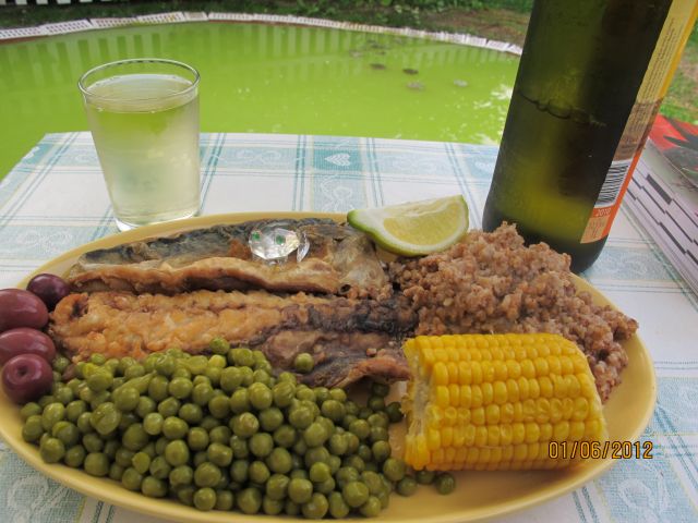Ni kosilo, ampak večerja....pa se vseeno moram malo hvalit: brancin, sveže ulovljen v Telašćici, zraven klasika iz blitve, krompirja in potoček babića