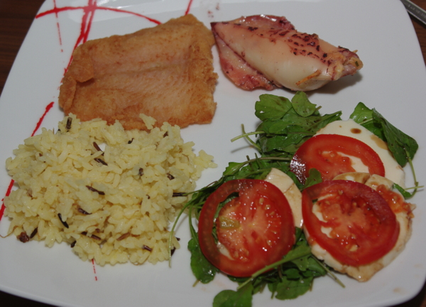 Danes pri nas: Rebrca na žaru z rukolo in kuhanim krompirjem, včerraj pa ajdovi krapi v jurčkovi omaki (so kuhali drugi